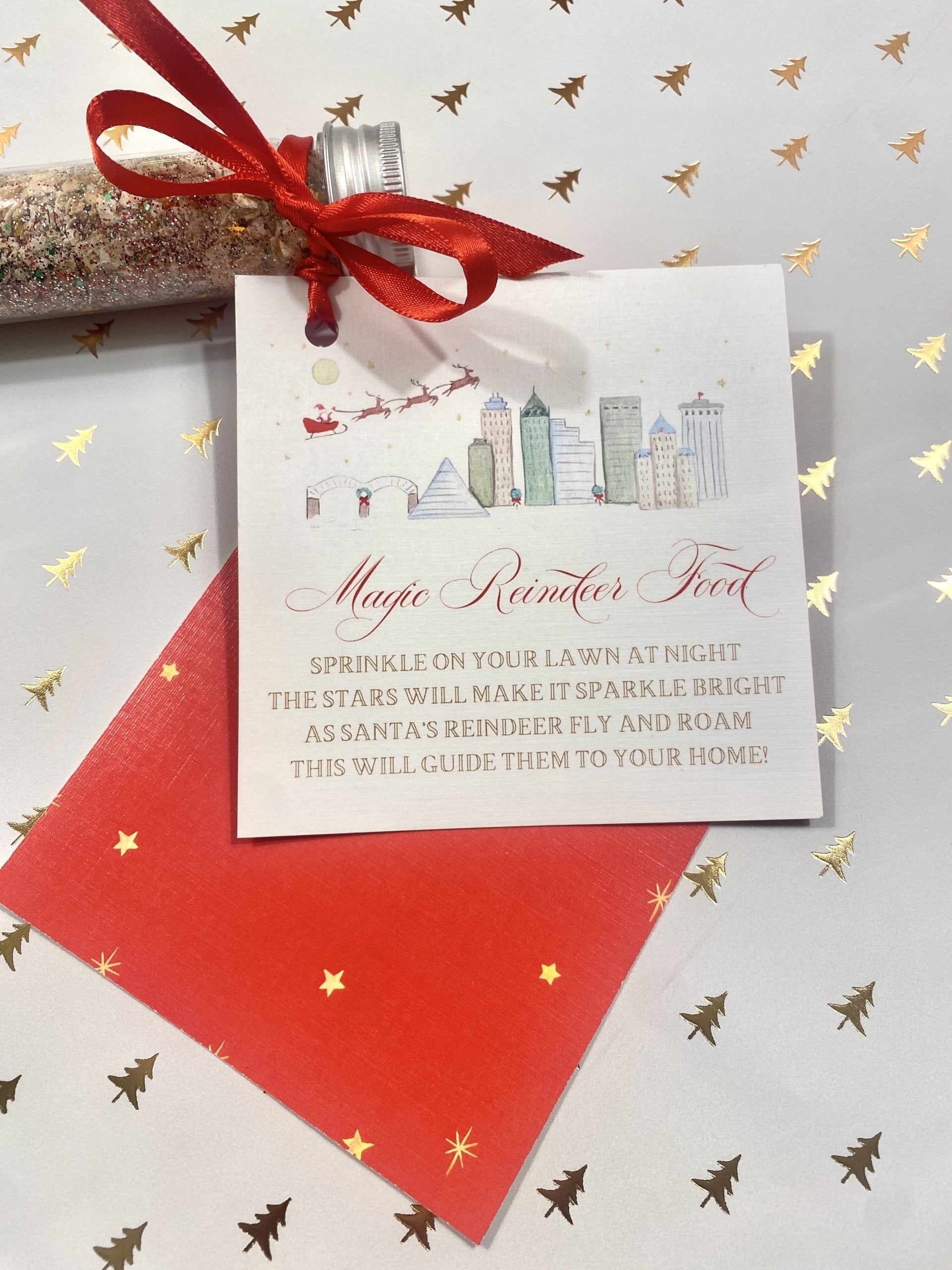 - Large hard plastic tube of reindeer food tied with 4x4” linen tag.