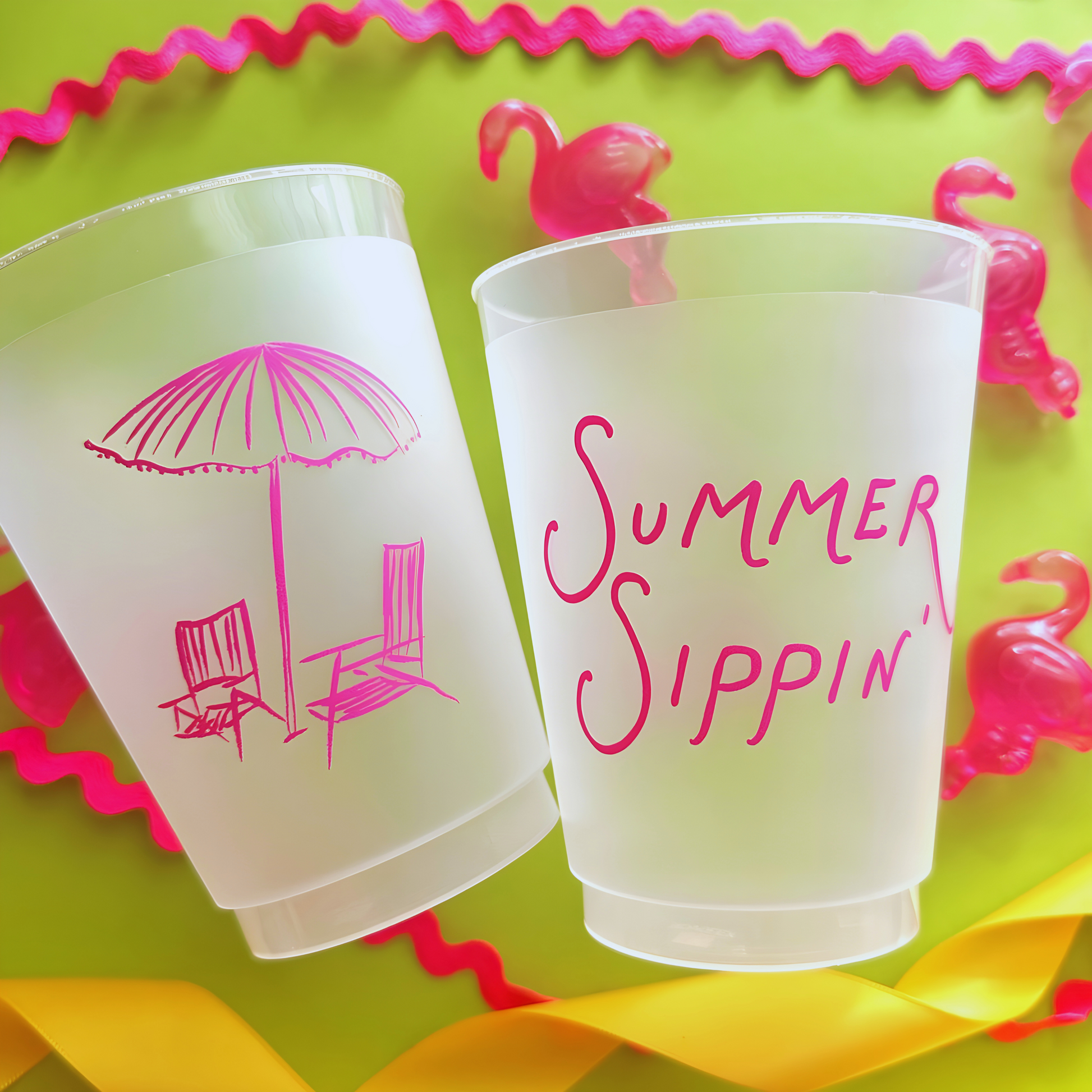 16 oz frosted reusable double sided cups, Front-Summer Sippin', Back-Umbrella and Chairs